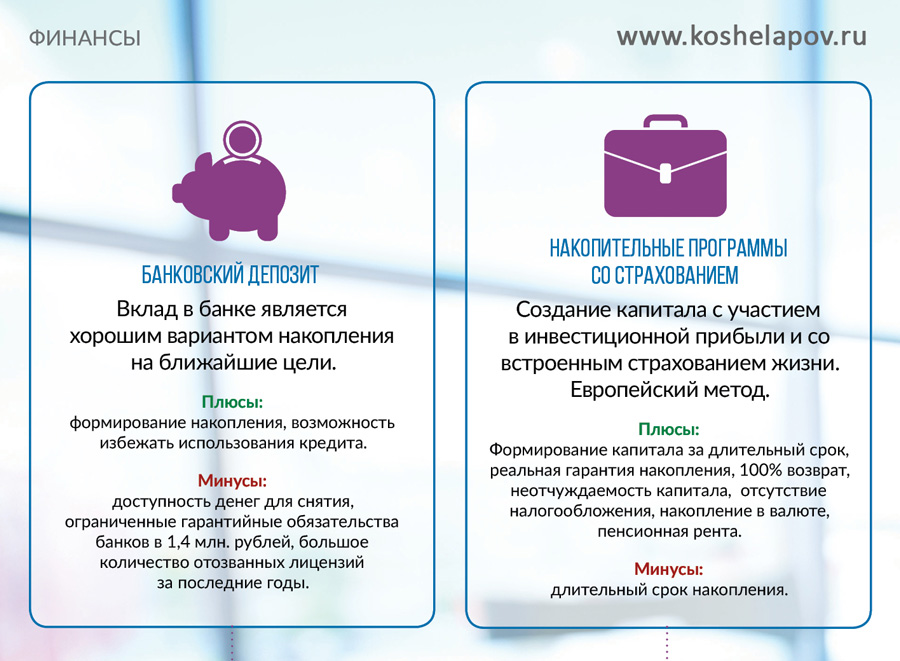 Минусы: доступность денег для снятия, ограниченные гарантийные обязательства банков в 1,4 мл. руб., большое количество отозванных лицензий за последние годы.
