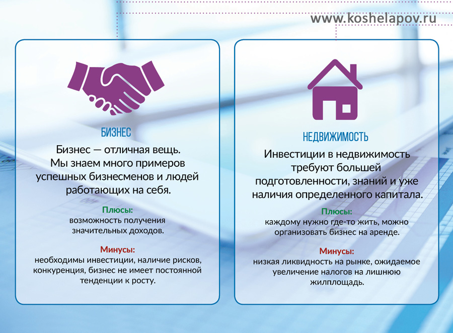 Плюсы: каждому нужно где-то жить, можно организовать бизнес на аренде.