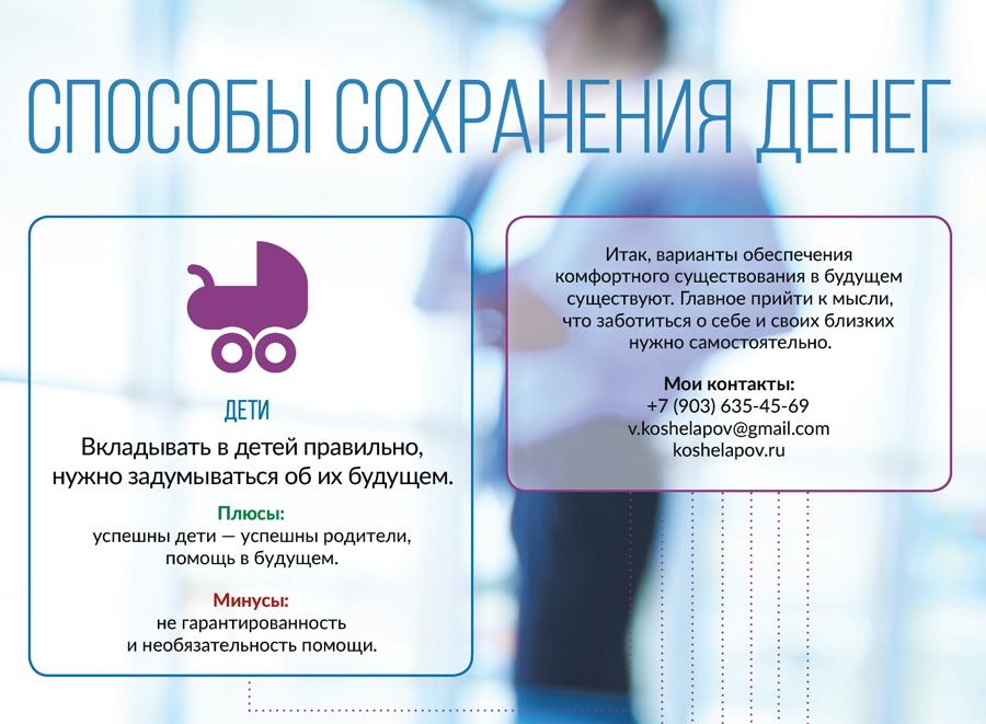 И вот в этой части нашей статьи я хотел бы частично ответить на эти два вопроса. Причем "будущее" нужно понимать в двух вариантах. Во-первых - это реализация ближайших целей - сделать ремонт, купить крупную бытовую технику или мебель, приобрести автомобиль. А во-вторых - это формирование неприкосновенного капитала на свое будущее , будущее детей и своей семьи (ребенку на первый взнос по ипотеке, на свадьбу, на образование, на дополнительную пенсию).